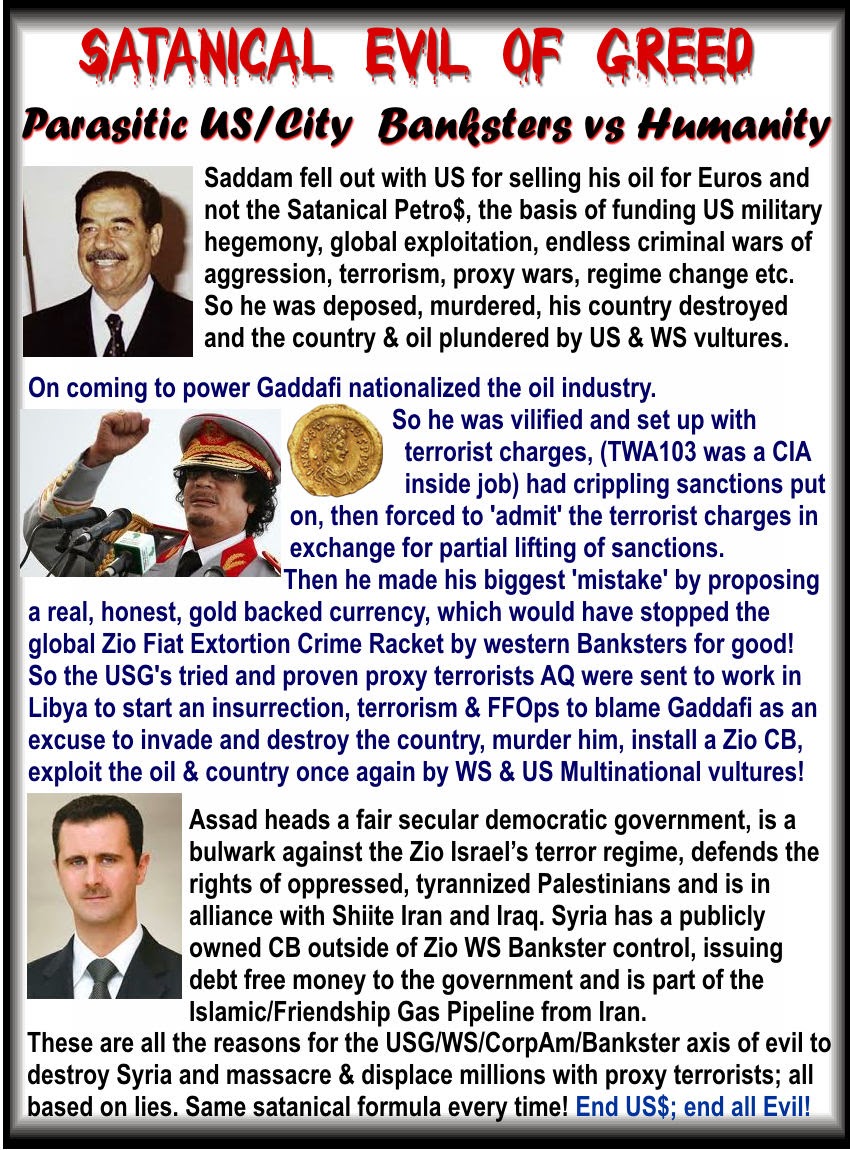 This was the tipping point, as with Saddam for switching to the € after 10 years of unilateral US imposed sanctions and 2 million deaths they caused, as with Iran who had equally unilateral, criminal US sanctions slapped on for the very same reason, Gaddafi wasn't going to undermine the Oligarchy's controlled Fiat Currency Crime Racket with a much more attractive, Gold backed alternative which would have prevented them from exploiting the African Continent to the same extent as they had hitherto!