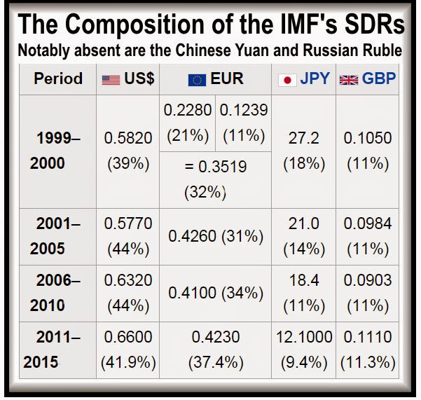 Presently the US$ makes up 41.73% of these Fiat SDRs. They are equal in all respects to the sick US$ and every Fiat currency and are just another instrument by the Oligarchy in power to stay in power, rape, plunder and to exert their political power over every nation.